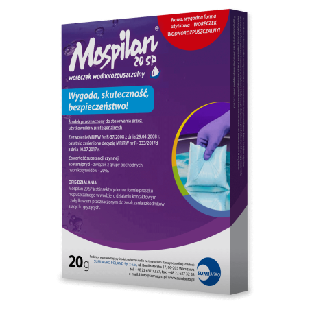 Mospilan 20 SP jest insektycydem w formie proszku rozpuszczalnego w wodzie, o działaniu kontaktowym i żołądkowym, przeznaczonym do zwalczania szkodników ssących i gryzących. Na roślinie działa powierzchniowo, wgłębnie i systemicznie.