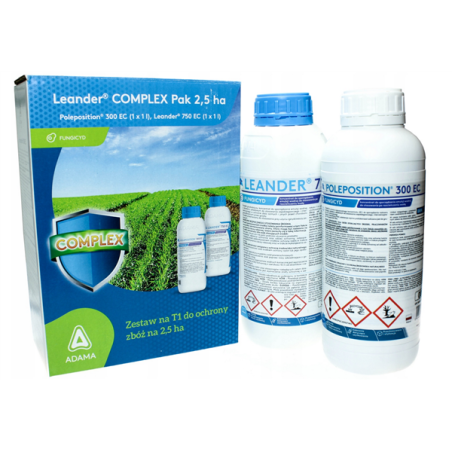 Leander® COMPLEX Pak to rozwiązanie fungicydowe oparte na dwóch produktach: Leander 750 EC i Poleposition 300 EC. Oba fungicydy aplikowane w mieszance zbiornikowej w terminie pierwszego zabiegu T1, niezwykle skutecznie chronią zboża przed najpowszechniejszymi chorobami, występującymi we wczesnym okresie rozwoju zbóż. Wykazują działanie zarówno zapobiegawcze, jak i interwencyjne. Dawkowanie 0,4L + 0,4L / ha. Pak na 2,5 ha